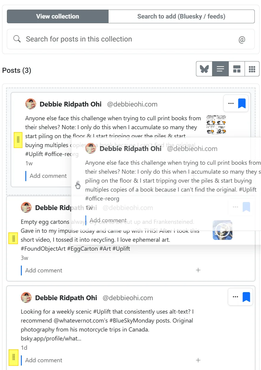 - When this is selected, a drag handle appears for each post in the “View collection” view (not in the “Search to add” list).