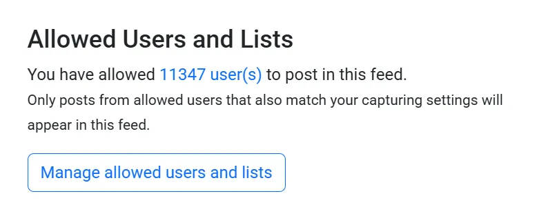 Section titled “Allowing users one by one”If you are on a free plan, you are only able to add users one at a time. From your feed dashboard, click Manage allowed users and lists and then Add user: