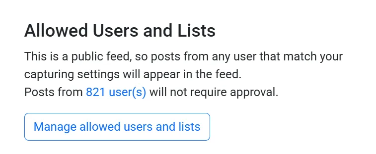 - For public feeds: Allowing a user is optional, and automatically approves their post if it would usually come in to your feed as ‘requires approval’.