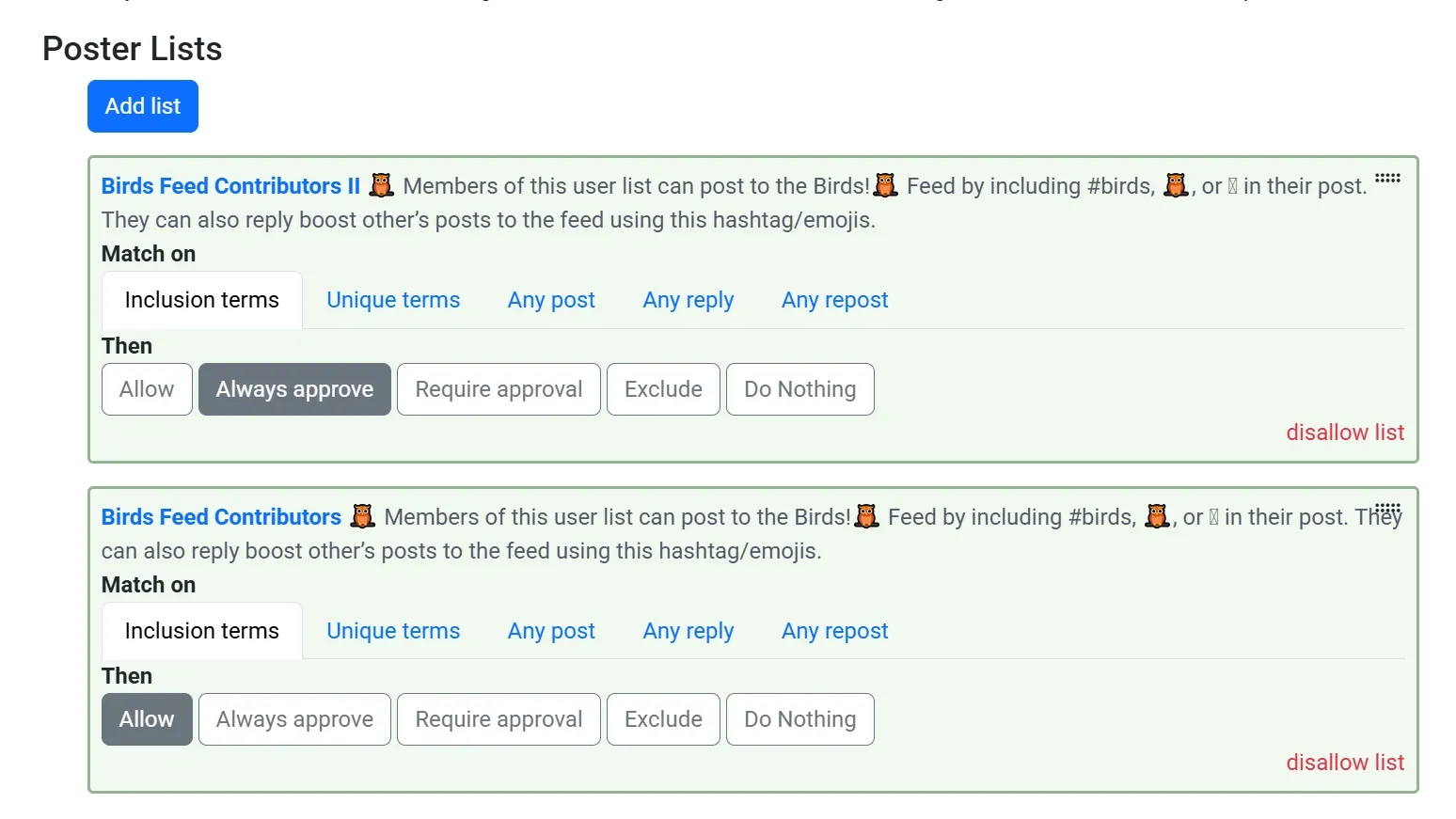 Once added, you will see the list under “Poster Lists”, where you can then manage what happens when posts are made by people on those lists: