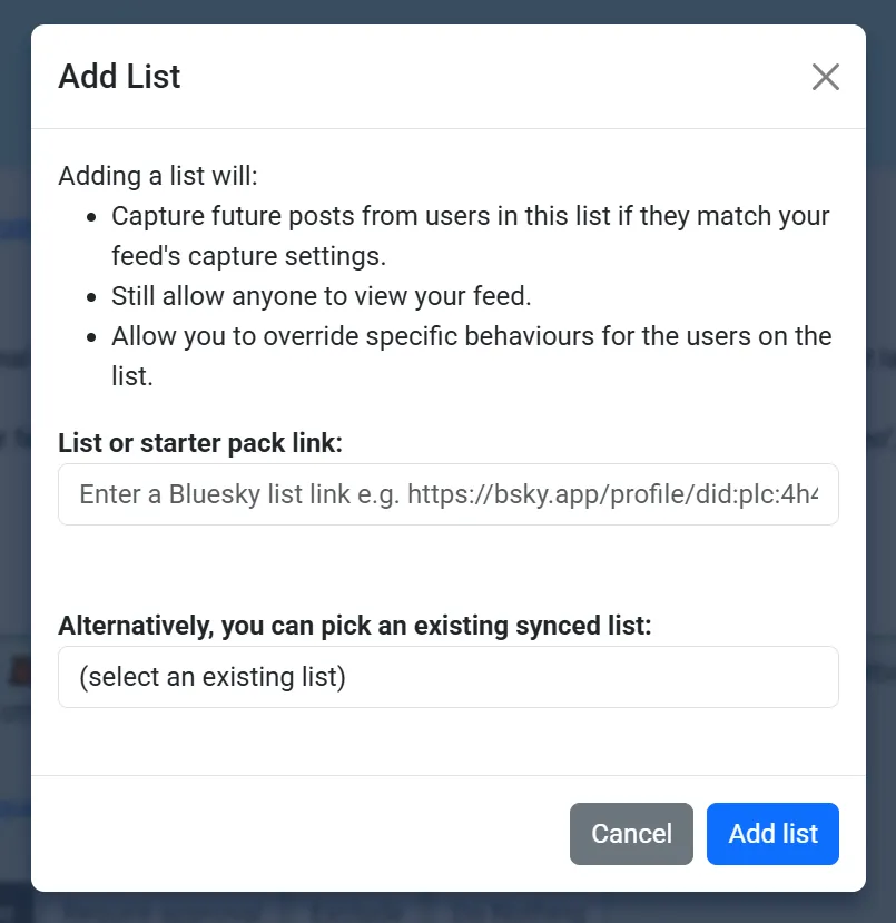 Section titled “Allowing users via a public Bluesky list”If you are on a paid plan, you are able to sync any Bluesky list in to your BSFC account. Once synced, a list can be used in multiple ways, one of which is allowing users in your feed. From your feed dashboard, click Manage allowed users and lists and then Add list: