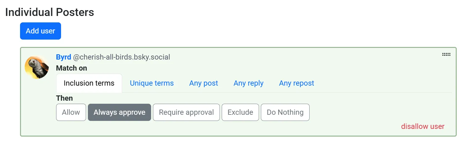 Once added, you will see the user under “Individual Posters”, where you can then manage what happens when that user makes a post: