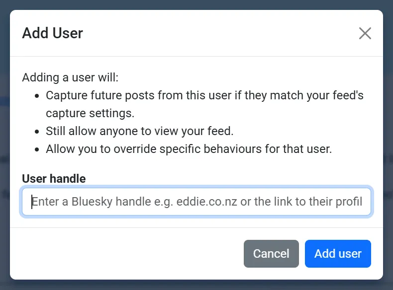 You can allow users in your feed in two ways, either via a public list in Bluesky or by manually adding them one by one.
