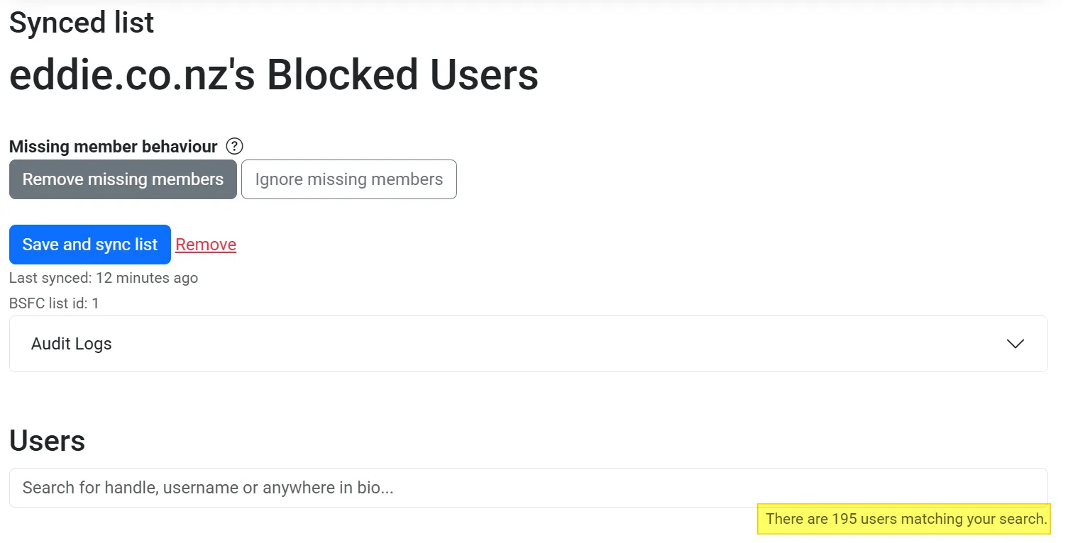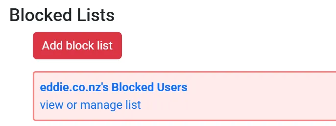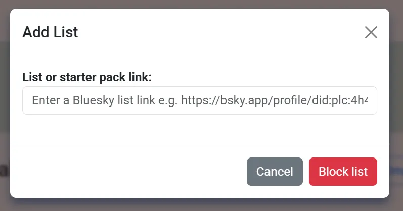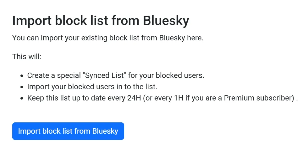Section titled “Syncing your own Bluesky block list”All users on either free or paid plans are able to import a block list comprising of the accounts you have blocked within Bluesky.