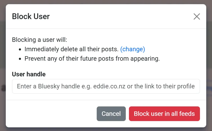 Section titled “Blocking users via a public Bluesky list”If you are on a paid plan, you are able to sync any Bluesky list in to your BSFC account. Once synced, a list can be used in multiple ways, one of which is blocking users in your feed. From your feed dashboard, click either Manage blocked users for this feed or Manage blocked users for all feeds and then Add block list: